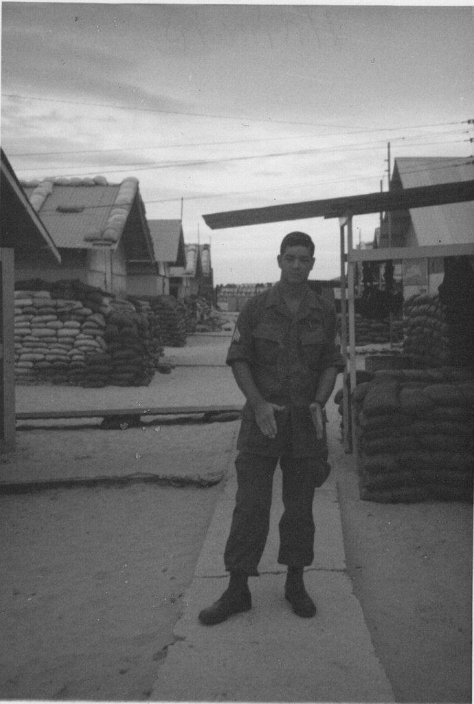 Sgt. Hamlin is standing in the Recon Com Area walkway between recon team hootches. He is pointing to a location where the NVA/VC sappers set up a machine gun to gun down SF men exiting their hootches at the attack was launched. This photo was taken in September 1968.