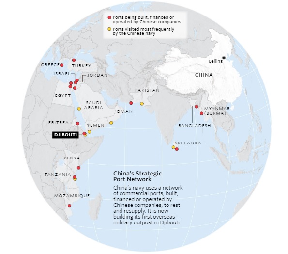 Due for completion next year, the naval outpost is expected to feature weapons stores, ship and helicopter maintenance facilities and possibly a small contingent of Chinese marines or special forces, according to foreign officers and experts monitoring its development. Its cluster of low-rise concrete buildings and shipping containers, some with Chinese flags, offers the most tangible sign yet of China’s strategy to extend its military reach across the Indian Ocean and beyond.