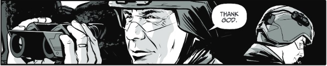 By directly identifying Russia and North Korea as the aggressors in both instances, these comics are making intentional choices about how the reader perceives them. Both comics open by providing some character development to their U.S. troops, either through banter or flashbacks to the all-American childhoods, playing football in the backyard. The enemy forces, on the other hand, remain completely faceless throughout, and with good reason. Just like the Stormtroopers in Star Wars, the Borg in Star Trek, zombies in the Walking Dead and the ninja Foot Clan in Teenage Mutant Ninja Turtles, robbing an opponent of their individuality, of their identity, also robs them of their humanity. We can hack at zombies and blast away at Stormtroopers because they aren’t people to us. They’re the nameless, faceless them we all fear.