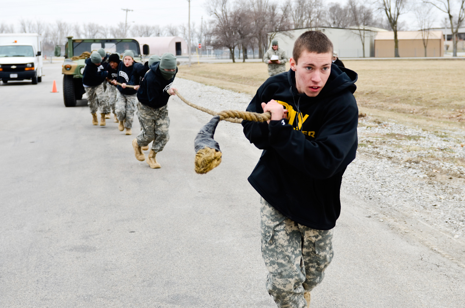 A team of Junior ROTC cadets (high school students) pulling a Humvee by rope in 2013. (Wikimedia Commons)