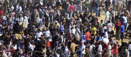 Here, thousands of Syrian refugees try to enter Turkey from rebel-controlled Syria.