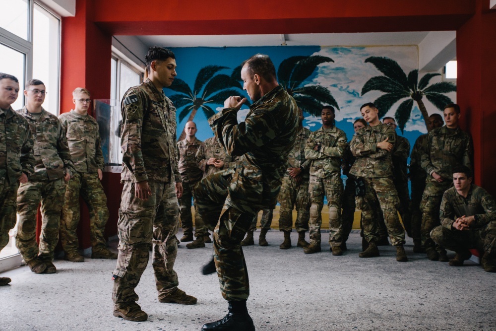 U.S. Army paratroopers assigned to Bravo Company, 2nd Battalion, 503rd Infantry Regiment, 173rd Airborne Brigade receive a class on Krav Maga from Greek experts during Exercise Iron Sword 19 in Kilkis, Greece, Nov. 20, 2019.