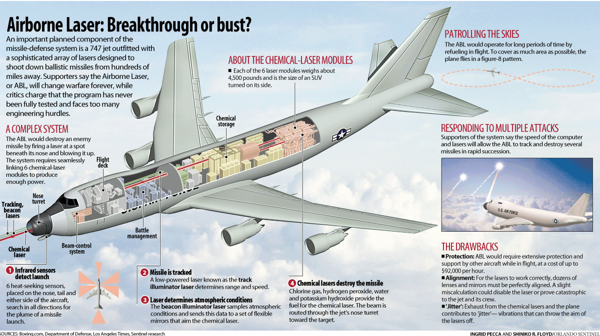 In a 5 second burst, the COIL laser uses enough power that could run a house for over an hour. That might not sound like a lot of power, but the COIL need not eliminate the missile with the beam itself. Instead, it uses two methods to persuade the missile to destroy itself: either using heat to increase the internal pressure of a liquid fuel tank until combustion or by heating a ring around the missile which causes structural failure.