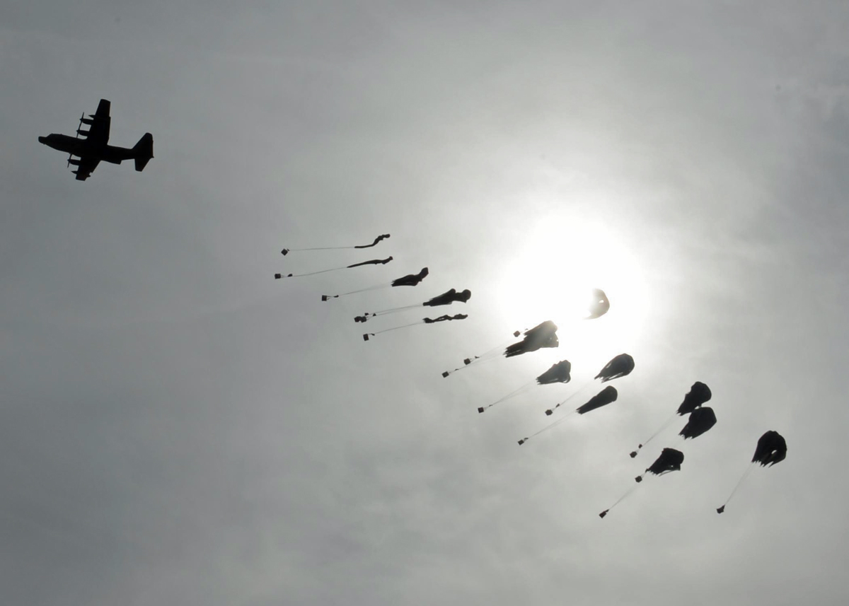 Two C-130 formations totaling 58 aircraft, 29 for personnel and 29 for heavy equipment, using the Adverse Weather Aerial Delivery System, can drop over 1,800 paratroopers plus their vehicles and artillery anywhere in the world without ever making visual contact with the drop zone. This storm of American military might have ruined the day of several two-bit dictators in the 80s and 90s.