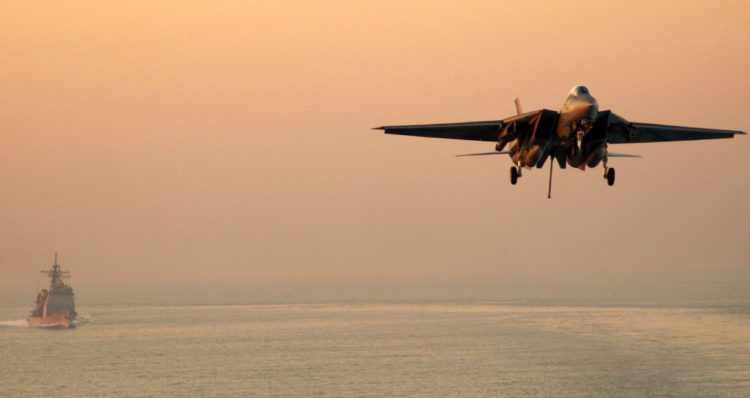 We can see the aircraft as it drops below the angled portion of the flight deck for a moment and it appears as though the jet has enough smash and, thanks to the massive lifting body provided by the Tomcat’s design, it is still actually flying.