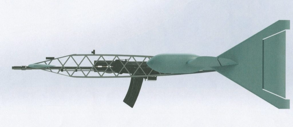 Subsequent images of the drone in question, acquired from the patent filed with Russia’s Institute of Industrial Property, support the assertion that this drone was built to house an off-the-shelf-looking Kalashnikov 7.62x39mm assault rifle. It also seems to lack any obvious means of propulsion, begging a number of questions about how this low-tech UCAV ever hopes to get off the ground.