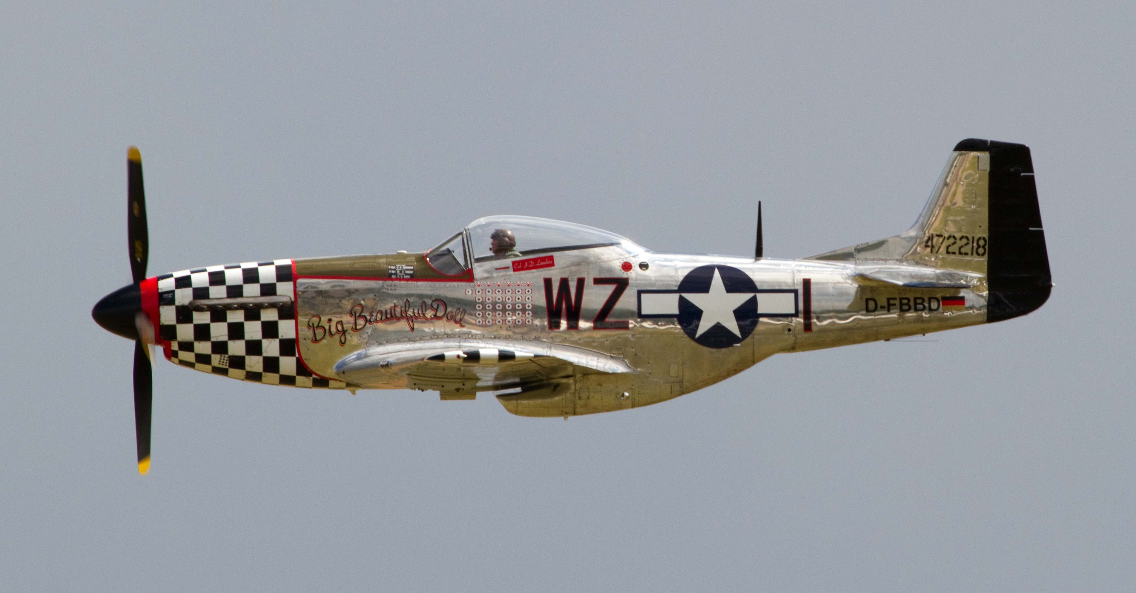 At least three restored P-51D Mustangs have been painted to represent “Big Beautiful Doll.” The first is serial number A68-192 which was initially delivered to the Royal Canadian Air Force in 1950 and flew until 1955, when it became an instructional airframe. Promoted to gate guard in 1960, the aircraft then made its way across the atlantic to become a static display piece for the Imperial War Museum in the UK as Colonel Landers aircraft.