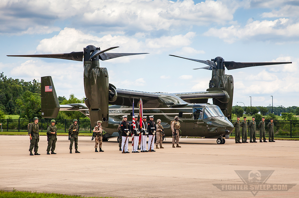 An eager crowd poured out of side doors of the Smithsonian Air & Space Museum’s Udvar-Hazy Center, straining to catch a glimpse of history as one of the last USMC CH-46 Sea Knights touched down for the final time. Hundreds of iPhones were raised in the air as the onlookers offered their own salute to the venerable ‘Phrog’ in its throwback Vietnam-era green paint scheme and its escort, a matching “greenside” MV-22B Osprey from HMX-1.