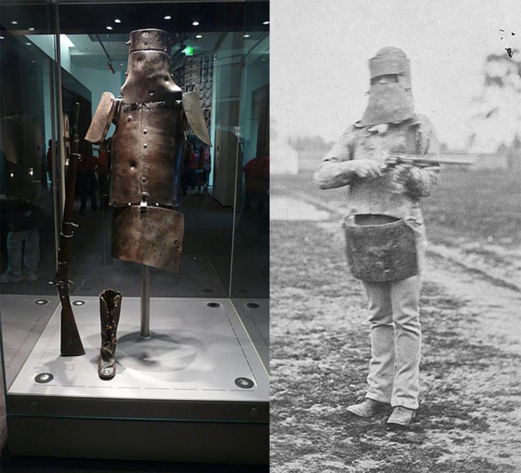 On the criminal side, many were fashioning together all sorts of various types of armor. The criminal Ned Kelly from Australia had built a suit with iron plates protecting the head and chest, and the entire iron get-up weight 97 lbs, padded on the inside. He and his outlaw family would have an infamous last stand against the police, where he was the only one to survive (and subsequently captured and executed). However, his suit of armor, made from the moldboards of plows, proved to be quite effective — 18 bullets had struck him, and it was the hanging that killed him.