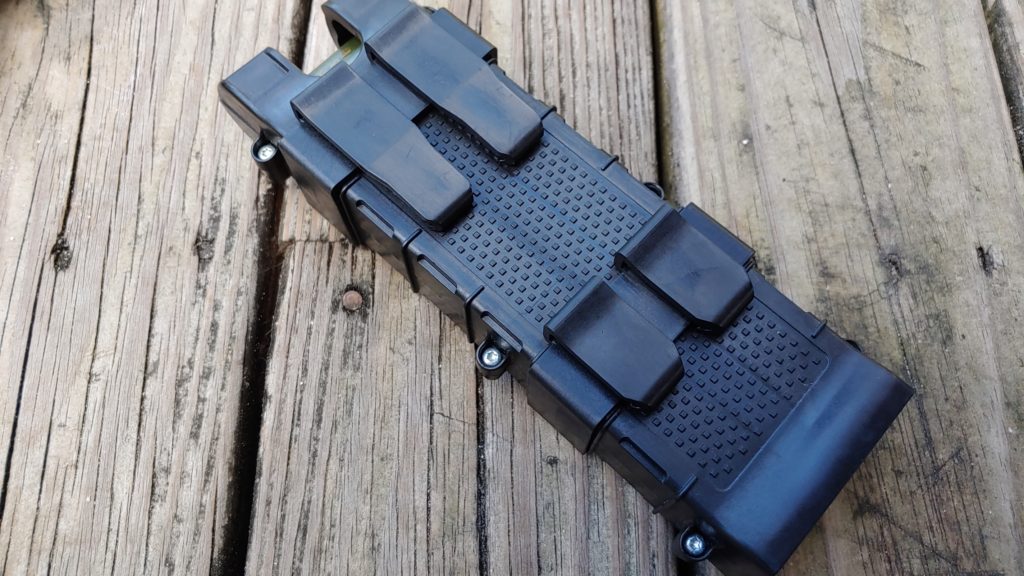 The AmmoPal is a Pez dispenser for shotgun shells, and that’s freaking awesome. It’s designed to allow for the easy carry of 10 rounds of 2.75” 12 gauge. It works a lot like a magazine. It’s a box with a spring and a follower that pushes rounds upwards against a set of two claws. It is designed to mount to modern MOLLE based gear and rides vertically. The rear of the AmmoPal has four clips that slide between MOLLE and lock it in securely. Additionally, you can secure it inside a double AR magazine pouch with ease. Heck, toss half a dozen into your range backpack and go!