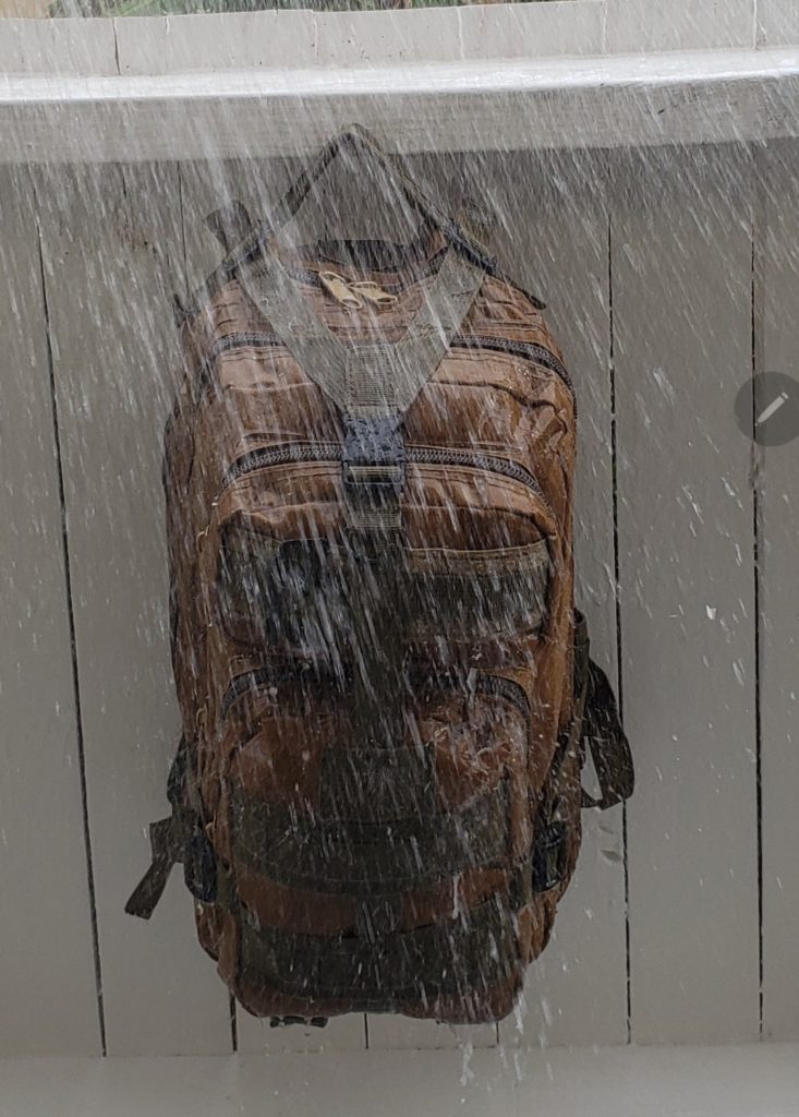 Next, I put the Military 3P Tactical 25L Backpack to a waterproofing test. I stuffed it with towels and showered it with a hose for five minutes to simulate a pretty good rain. This pack does not claim to be waterproof but I would say it has decent water resistance. Some water entered through the zipper seams and got the towels wet, but not soaked. I don’t see this as too big a deal, if you have any sense in terms of camping you would spray this pack down inside and out with Camp-Dry and put your important stuff in plastic bags anyway. But used as an around-town day-pack it does provide some water resistance. It also dried out in the sun in about 20 minutes, which was good.