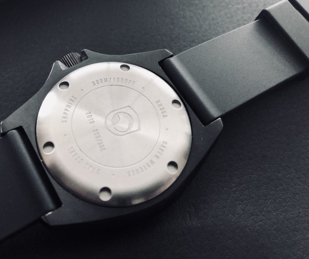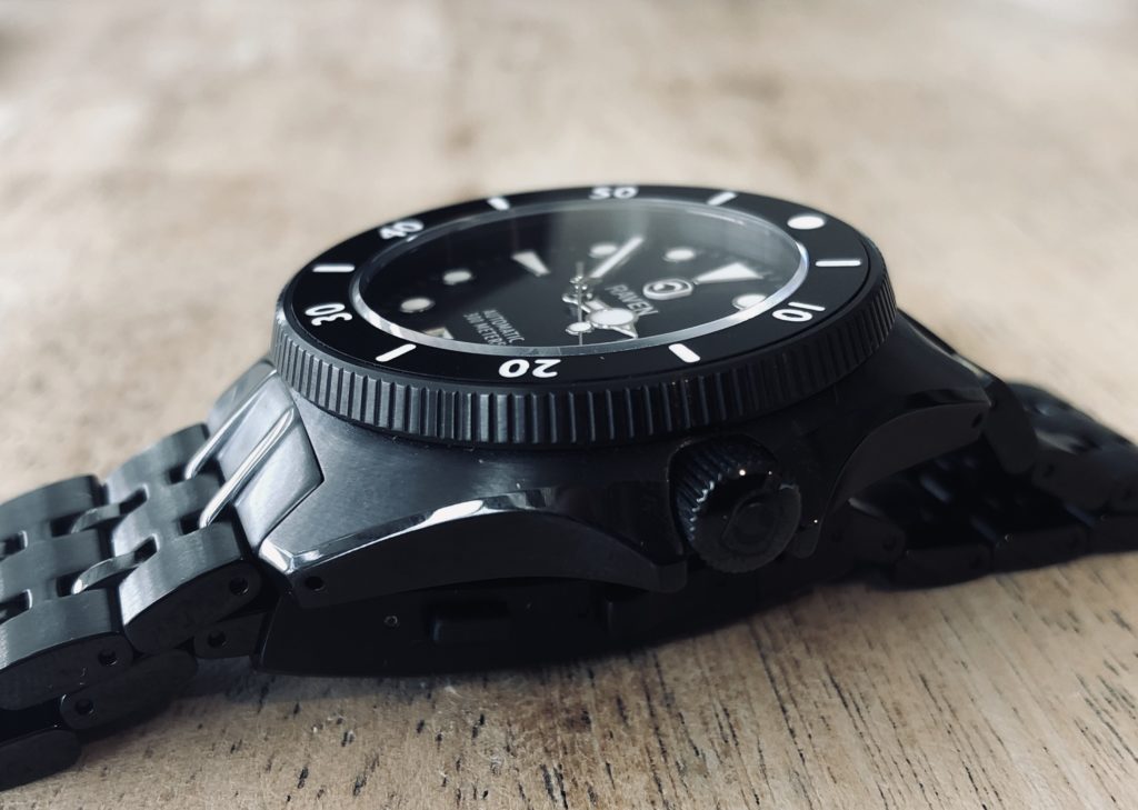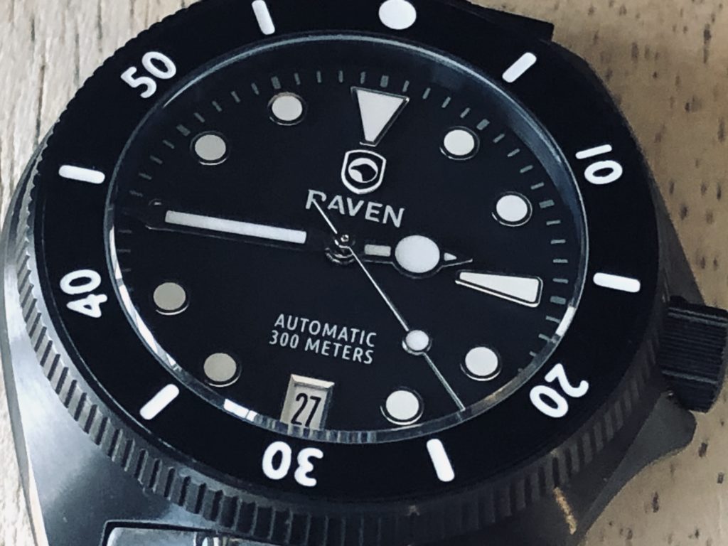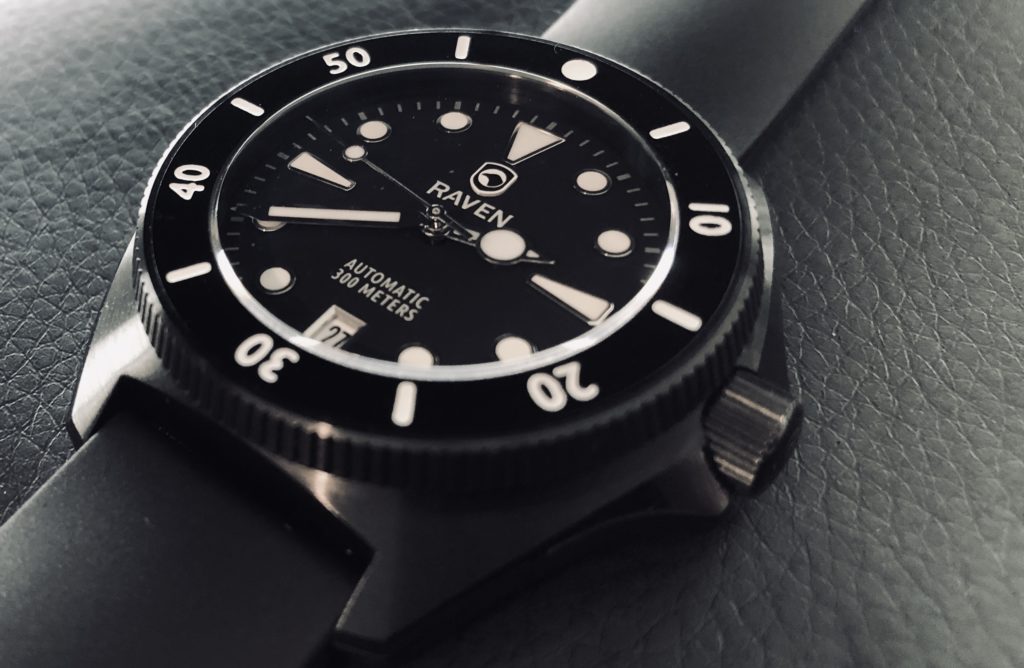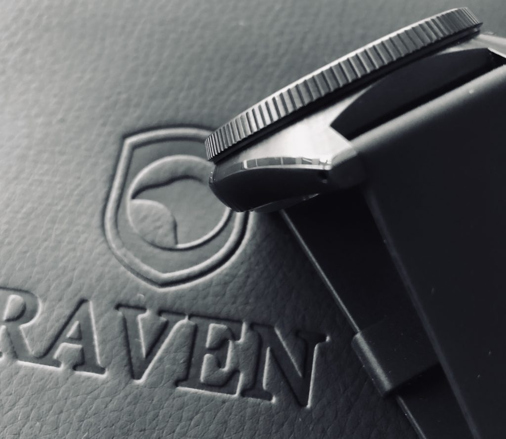 Raven Watches is owned and operated by Steve Laughlin. They are headquartered and designed in Overland Park, Kansas. Raven features several watches at various price points that correspond with different design and movement options. For the Solitude, it houses the uber-reliable Seiko NH35A automatic movement, a Sapphire crystal, 300m water resistance, and a date window at 6 o’clock. The unidirectional bezel is very crisp and comfortable to move, with no extra movement or wiggle.