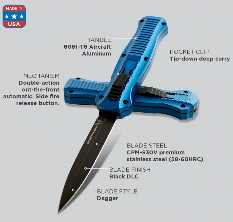 This iteration of the popular Infidel OTF (out-the-front) platform features the introduction of a bold new anodized blue handle (.59″ thickness) to a family of tactical knives that sported more traditional colors. The handle material is 6061-T6 aluminum. It looks a little blocky from certain angles, but it is very comfortable to hold and deploy. The total weight comes in at 4.90oz so it isn’t heavy enough to be noticeable while carrying. I’ve got average-sized hands and this knife feels great in every way. It wasn’t simply the handle color that got an upgrade — the blade did too.