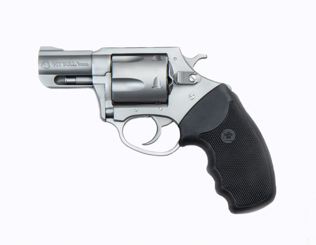 The Pitbull presents a mid-sized snub nose with a full-length grip, exposed hammer, and five shots of 9mm for social work.
