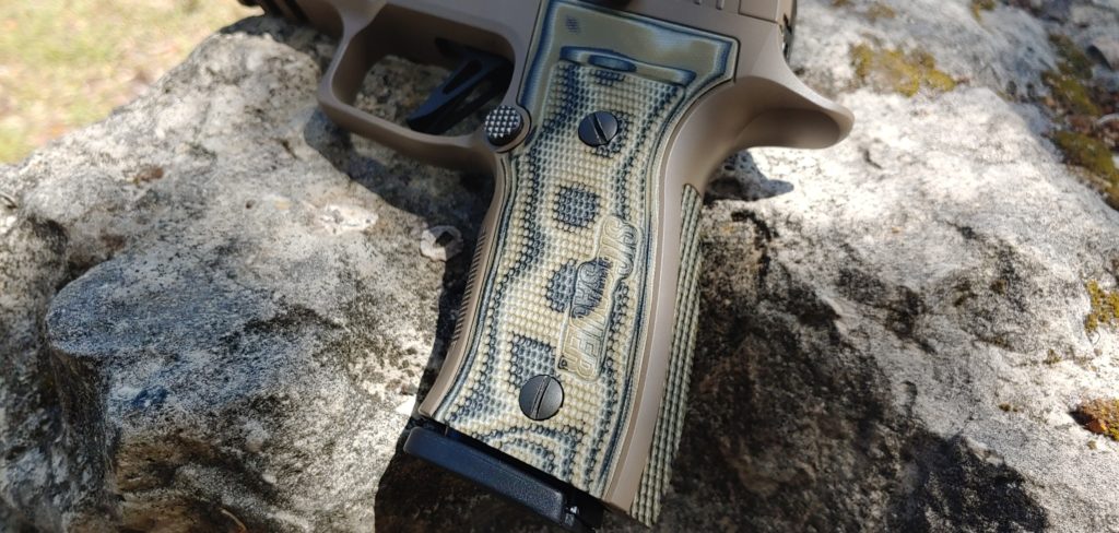 A metal grip module provides the P320 AXG with an insanely ergonomic frame. My particular model falls under the SIG Sauer Scorpion line. Scorpion means it’s flat dark earth in color, wears custom G10 grips, and looks sexy as hell. The carry model you see here utilizes a full-sized frame with a compact slide. It makes for an extremely well-balanced weapon.