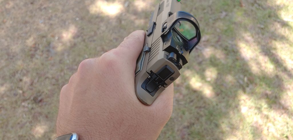 The top of the slide has been cut for an optic, and I included the SIG Romeo1PRO as my red dot of choice. It turns out it’s a very well-designed optic and provides professional-grade durability. It’s a perfect match for the P320 AXG. I only wish it came in FDE as well.