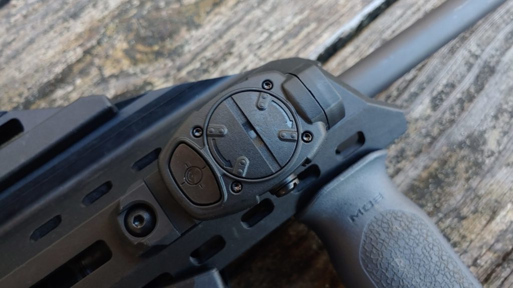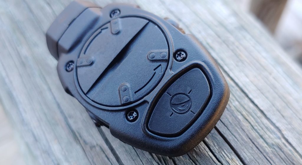 It’s a single button control that flips the light on or off. The battery compartment is evident and swapping batteries does not require moving the light from the mounted platform. It’s very simple, reliable, and easy to use.