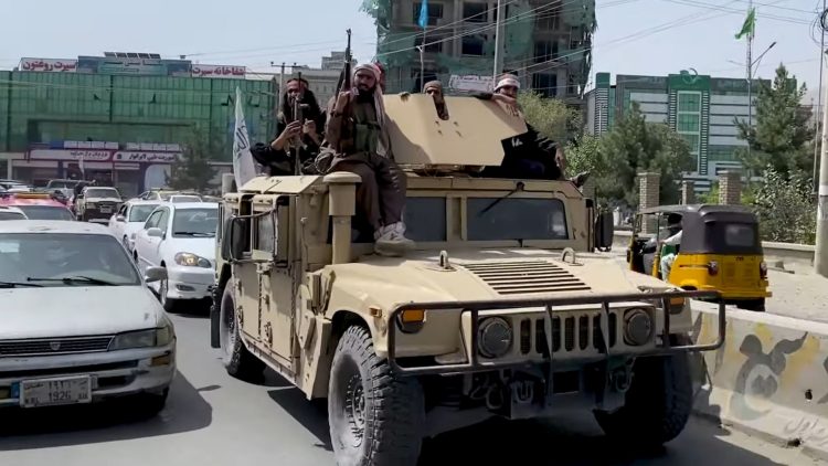 Taliban fighters ride a captured Humvee following the fall of Kabul, August 2021. (Wikimedia Commons)