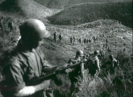 After the moon had set at 2300 hours, the friendly elements used red lens flashlights to signal columns in the rear and move into a half-mile long skirmish line 500 meters from enemy forces. From Darby’s position he could see the red light signals which confirmed his elements were online. With Able Company at the left, Easy Company at the center, and Fox Company at the right, the men fixed bayonets and quietly approached their objective.