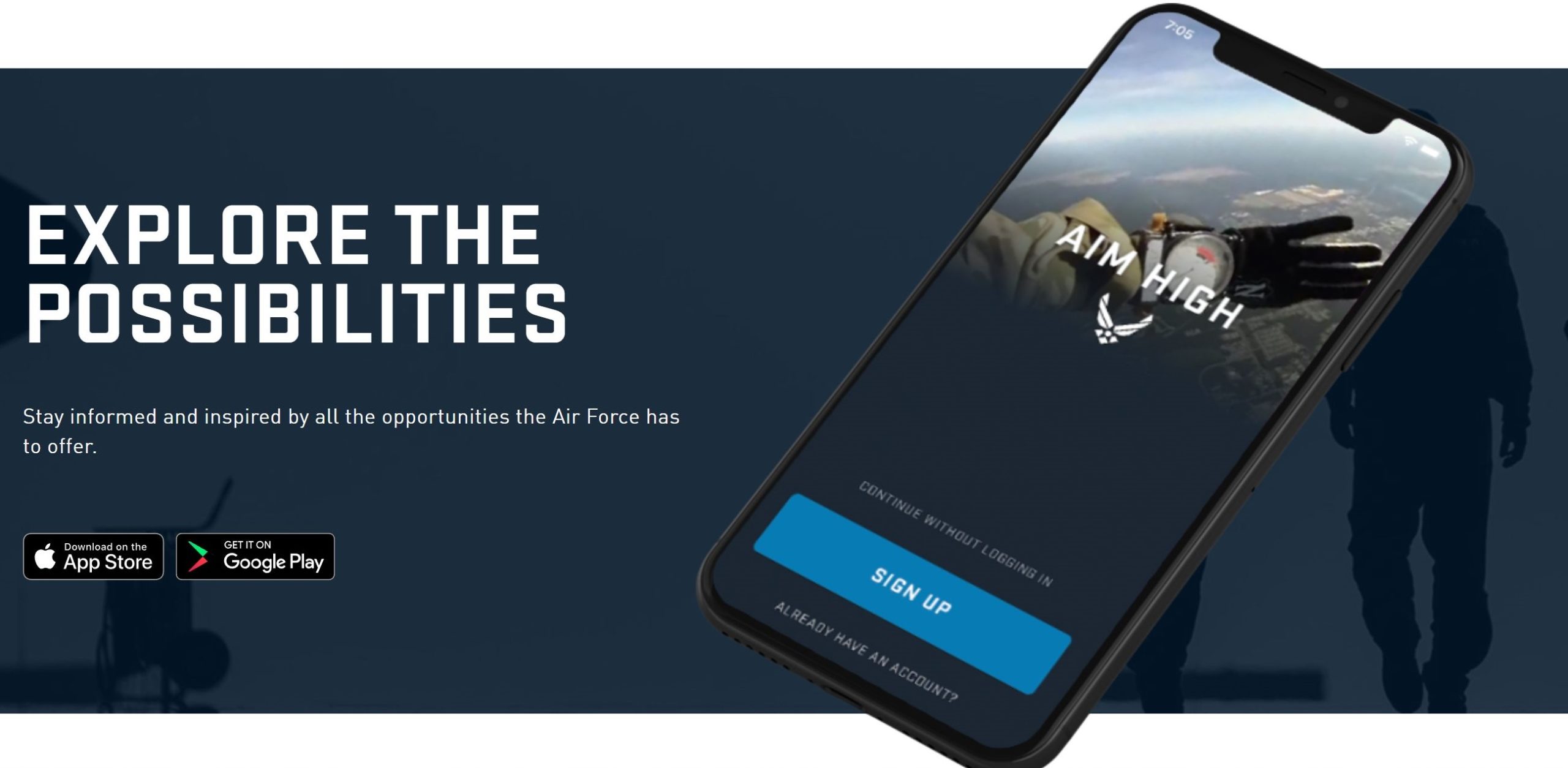Maybe they haven’t changed their motto. The “Aim High” verbiage is clearly present on their current recruiting/informational app. Screenshot from the official US Air Force website