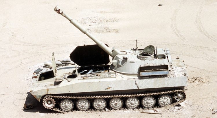 An Iraqi 2S1 Gvozdika 122mm self-propelled howitzer lies stranded in the desert after being deserted by Iraqi forces during Operation Desert Storm, circa 1991. (Image source: Wikimedia Commons)