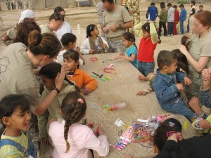 The Iraqi children varied in age and gender. They were always so happy to see us as got out of our vehicles. Most of them would fight over who got to hold our hands. We would do normal scout type activities such as arts and crafts, playing games, and playing sports. Soccer was always a favorite. Tons of care packages from American scout troops would help facilitate the activities. The children’s faces would light up when they got small presents like hair ties or stickers. Sometimes they would get new clothes or shoes, which was desperately needed. Most kids wore clothes and shoes that were at least two sizes too small. It was during these times that they got to embrace what remained of their childhood before being thrust into an early adulthood (an unfortunate consequence of living in Iraq).