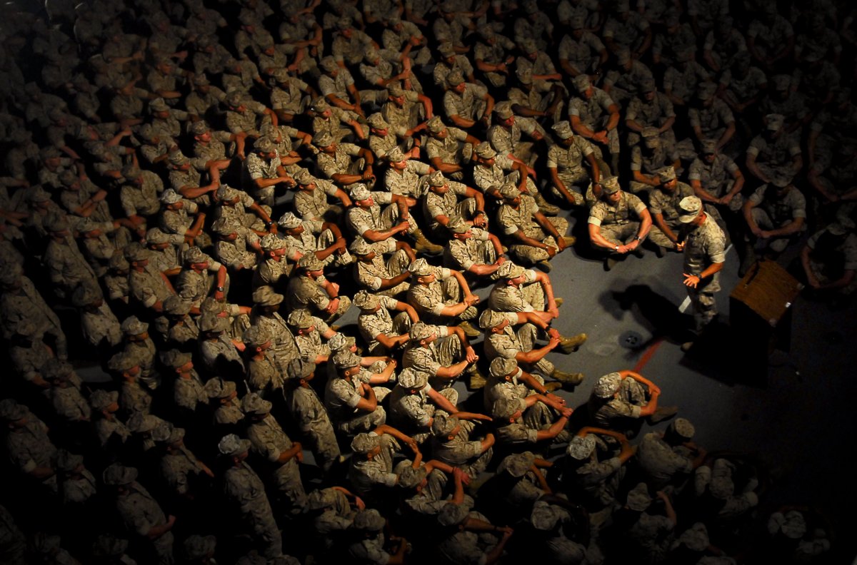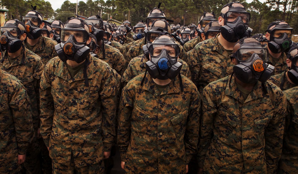 Recruits at Recruit Depot Parris Island stand in formation as they prepare to enter the gas chamber.