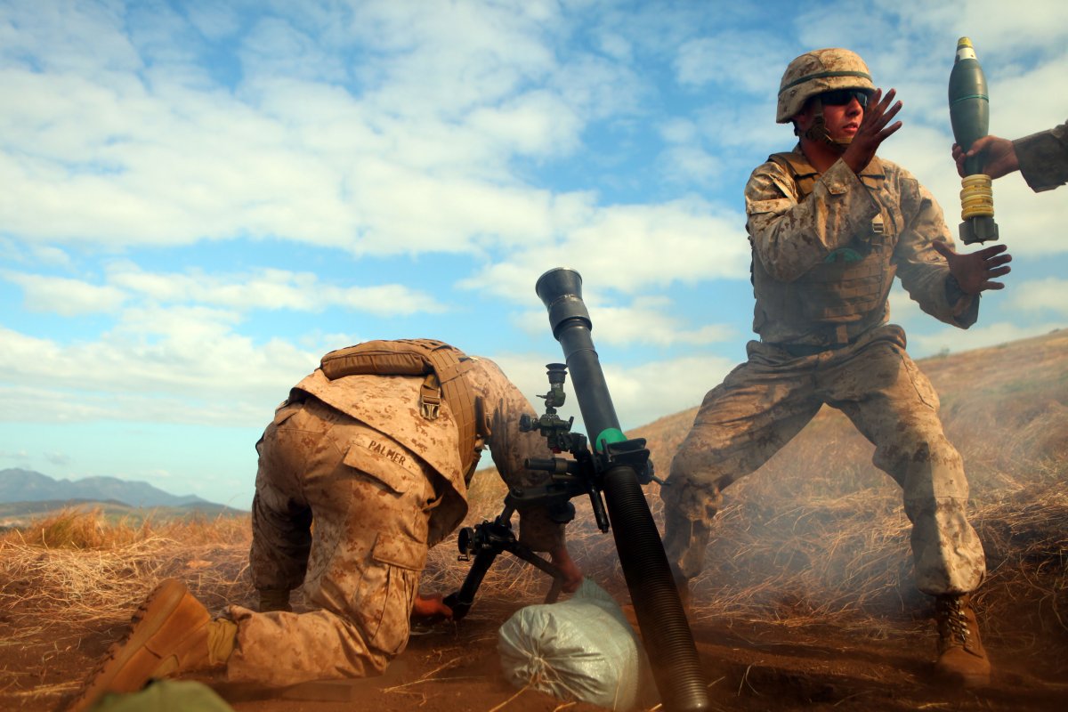 Lance Cpl. Kyle J. Palmer (left), holds a mortar tube steady as Lance Cpl. Samuel E. Robertson (right), mortarmen with the 81mm Mortars Platoon, Weapons Company, Battalion Landing Team 2nd Battalion, 7th Marines, 31st Marine Expeditionary Unit, grabs another mortar round during a joint live fire exercise, July 14.
