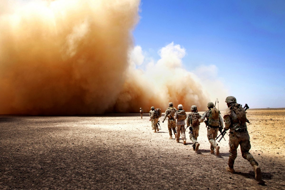 US Marines assigned to Georgian Liaison Team-9 and Georgian Army soldiers assigned to the 33rd Light Infantry Battalion make their way to the extraction point during Operation Northern Lion II in Helmand province, Afghanistan, July 3, 2013.