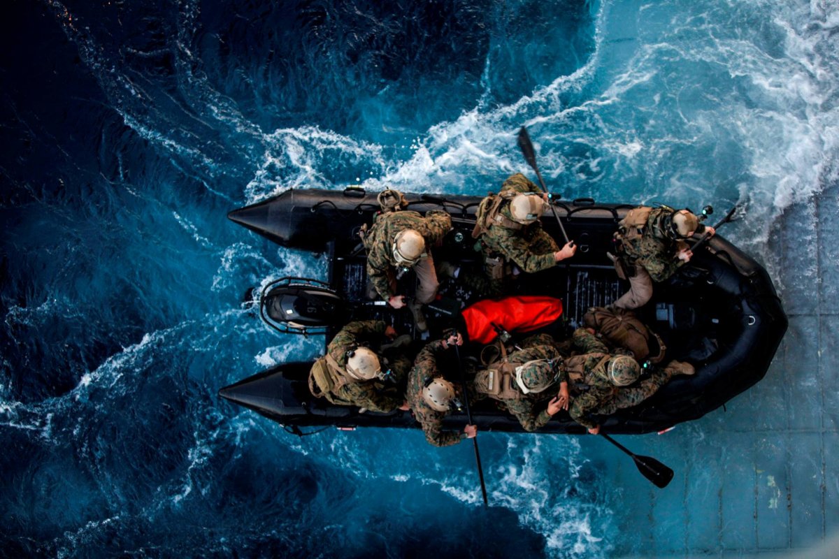 Marines with the 15th Marine Expeditionary Unit Maritime Raid Force depart the USS Essex (LHD 2) on a combat rubber raiding craft during Amphibious Squadron Three/Marine Expeditionary Unit Integration Training (PMINT) off the coast of San Diego March 4, 2015.