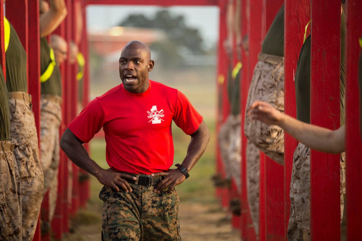 Drill Instructor Sgt. Daniel Anderson motivates recruits during physical training at Marine Corps Recruit Depot Parris Island on December 4, 2014.