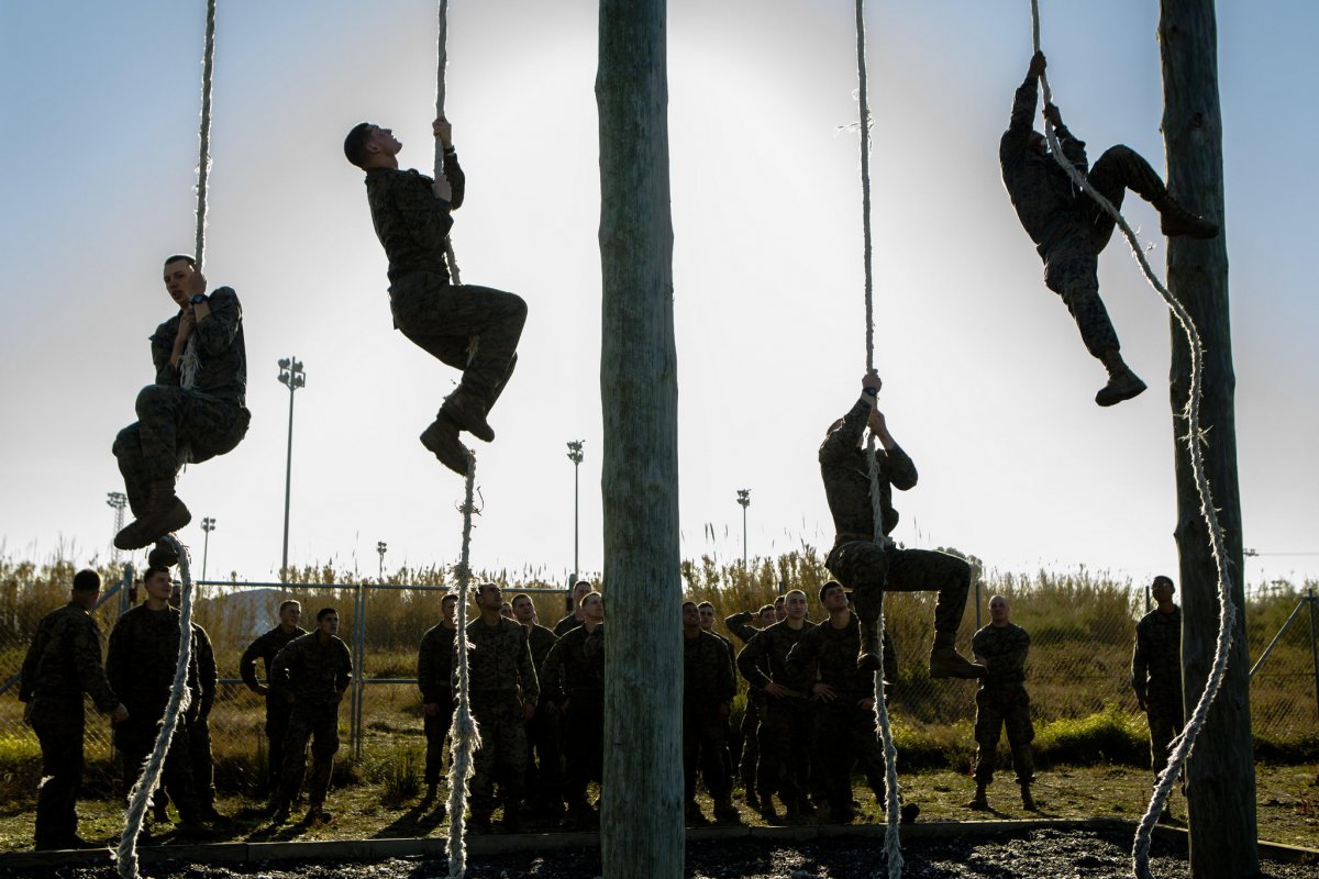 U.S. Marines with Special-Purpose Marine Air-Ground Task Force Crisis Response-Africa ascend ropes during an obstacle course on Rota Naval Base, Spain, Feb. 26, 2015.