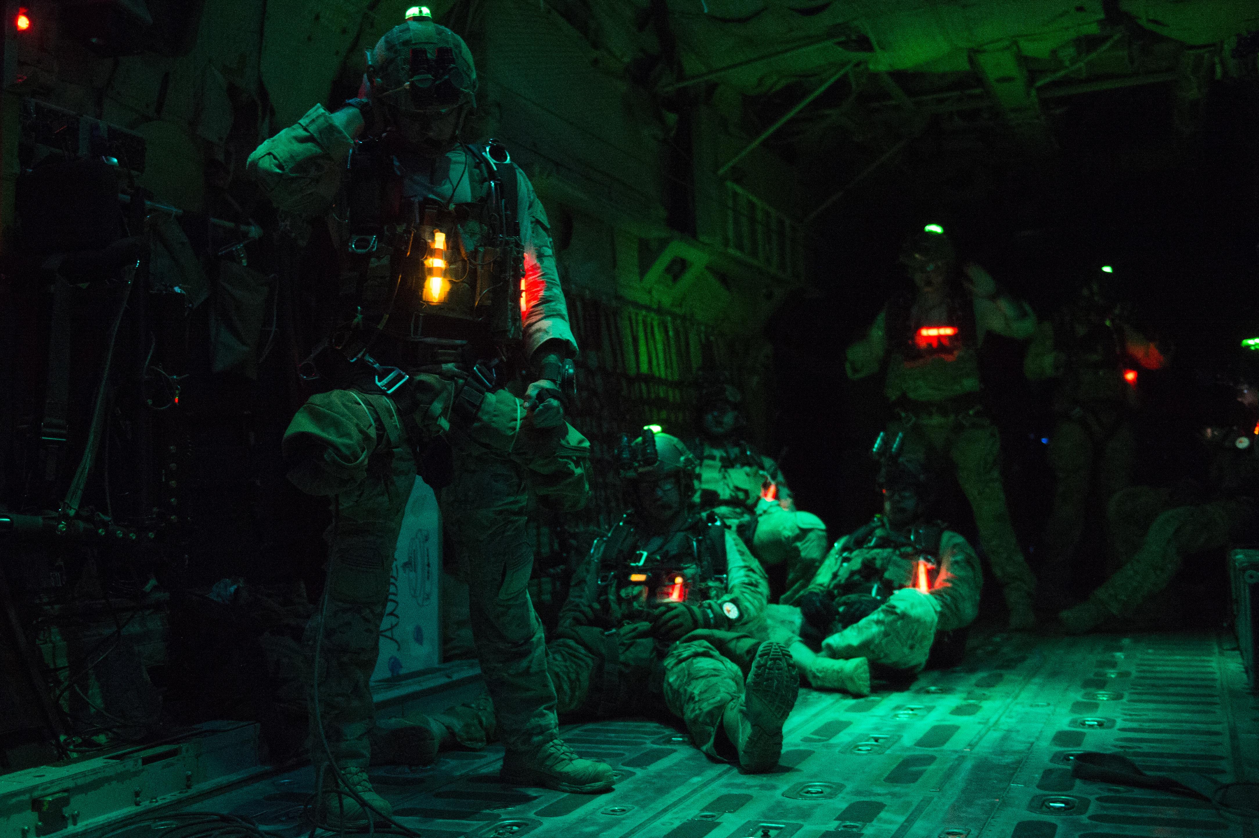 Pararescuemen from the 82nd Expeditionary Rescue Squadron prepare for a night jump from a C-130 Hercules over Grand Bara, Djibouti March 20, 2017. The training allowed the pararescuemen to maintain their qualifications on night jumps. The 82nd ERQS conducts full spectrum personnel recovery, casualty evacuation, medical evacuation, and sensitive item recovery in support of Defense Department personnel. (U.S. Air Force photo/Tech. Sgt. Joshua J. Garcia)