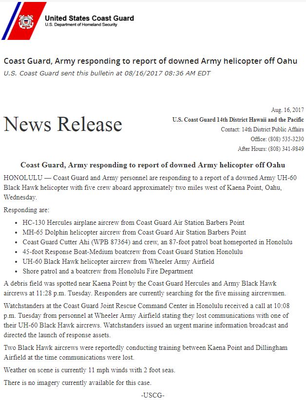 A Blackhawk UH-60 carrying five crew members crashed into the Pacific Ocean off the coast of Hawaii on Tuesday evening. After Wheeler Army Airfield lost communication with the aircraft, the Coast Guard was called to assist with the search for the missing aircraft and crew members at 10:08pm (local time). It was at 11:30pm that a debris field was located about 2 miles west of Kaena Point, Oahu. According to the Coast Guard press release, several boats and aircraft have responded to the search.
