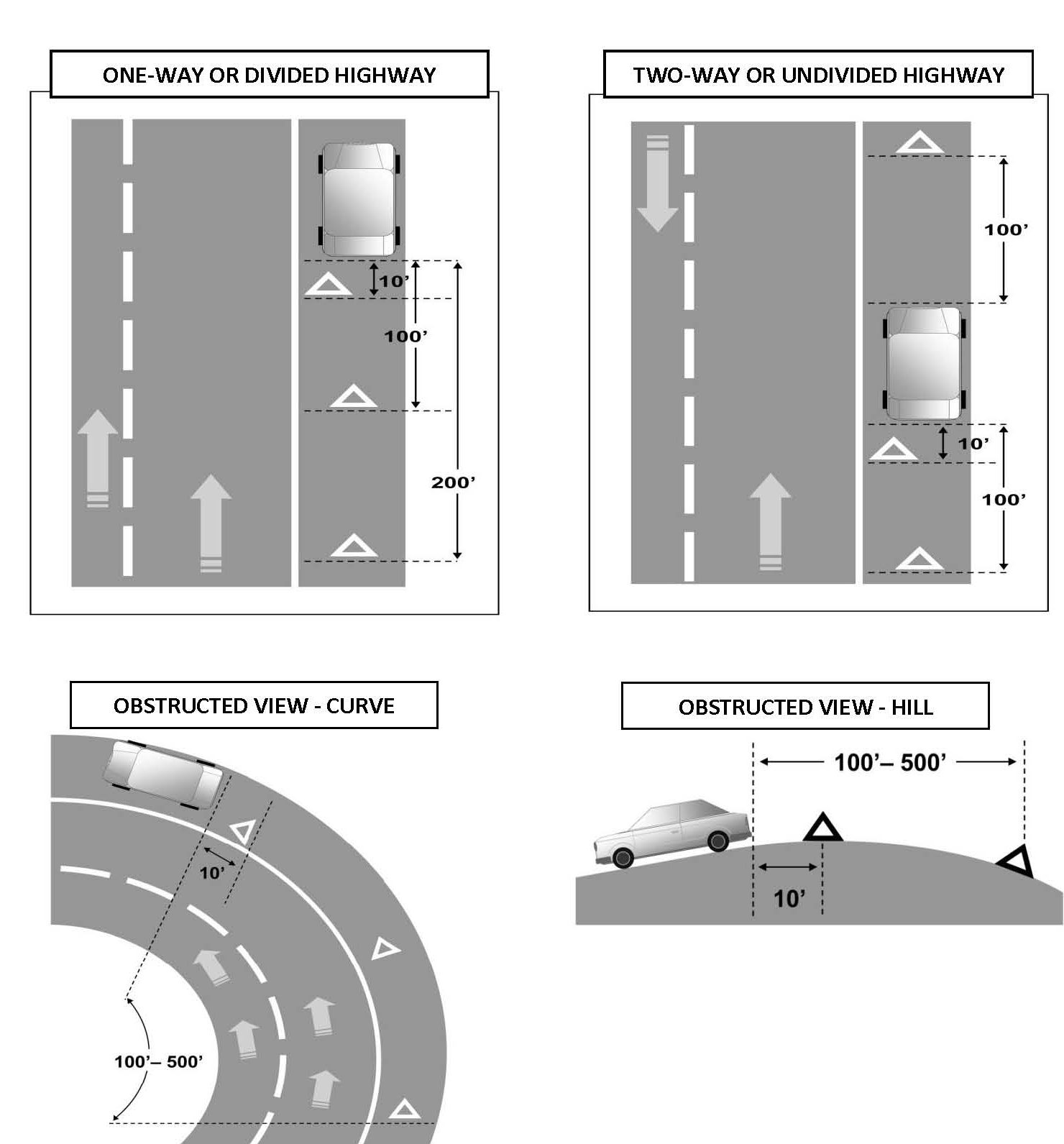 While wearing your vest, you’ll commonly place the first of three warning triangles/flares ten feet, center behind your vehicle. Then get off the pavement, and behind the barrier and walk two hundred feet to place the second triangle/flare, and repeat for the third triangle/flare. These warnings should hopefully forewarn other drivers to avoid you and your vehicle but don’t over-invest any hope in humanity. For other examples of placement, see the chart below.