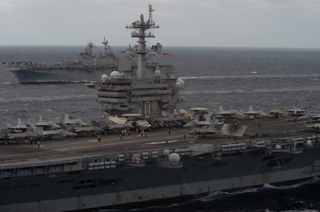 The Nimitz-class aircraft carrier USS Carl Vinson (CVN 70), front, and Wasp-class landing helicopter dock USS Essex (LHD 2) transit the Philippine Sea Jan. 22, 2022. Operating as part of the U.S. Pacific Fleet, units assigned to Carl Vinson and Abraham Lincoln Carrier Strike Groups, Essex and America Amphibious Ready Groups, and Japan Maritime Self-Defense Force are conducting training to preserve and protect a free and open Indo-Pacific region. (U.S. Navy photo by Mass Communication Specialist Seaman Larissa T. Dougherty)