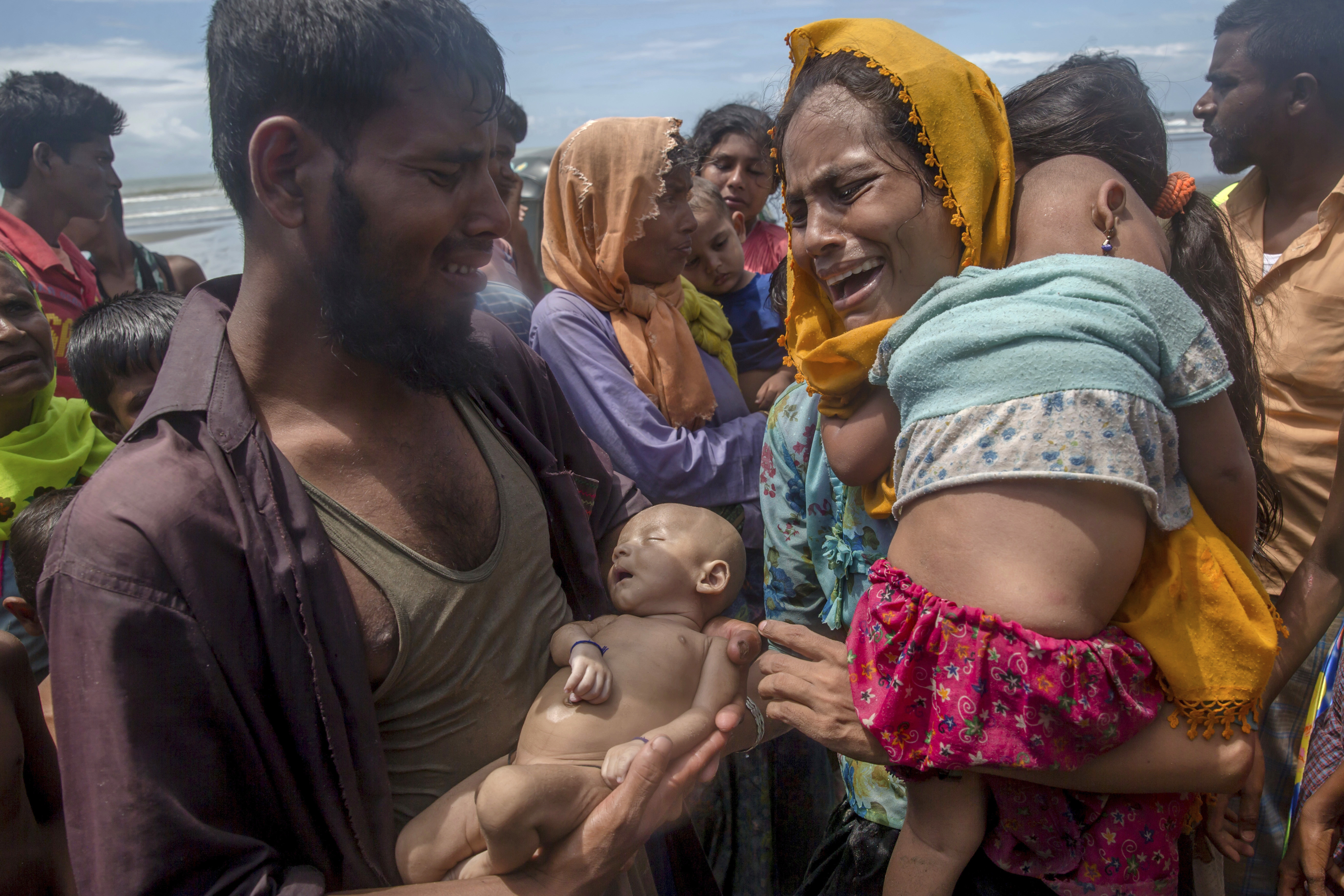 A Rohingya Muslim man Naseer Ud Din holds his infant son Abdul Masood, who drowned when the boat they were traveling in capsized just before reaching the shore, as his wife Hanida Begum cries upon reaching the Bay of Bengal shore in Shah Porir Dwip, Bangladesh, Thursday, Sept. 14, 2017. | AP Photo/Dar Yasin