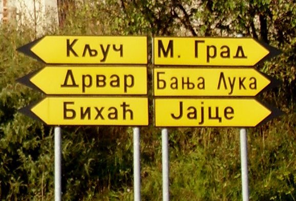 Cyrillic road signs in the RS (left column then right): Ključ, Drvar, Bihać, M. Grad, Banja Luka, Jajce.