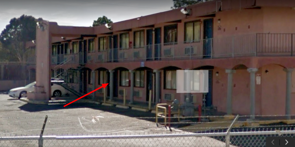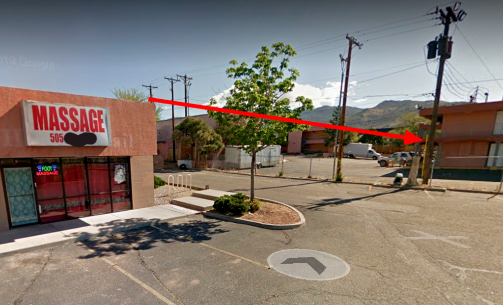 Seen from the massage parlor, the red arrow points to Spicy Mike’s motel room door just at the base of the stairwell.