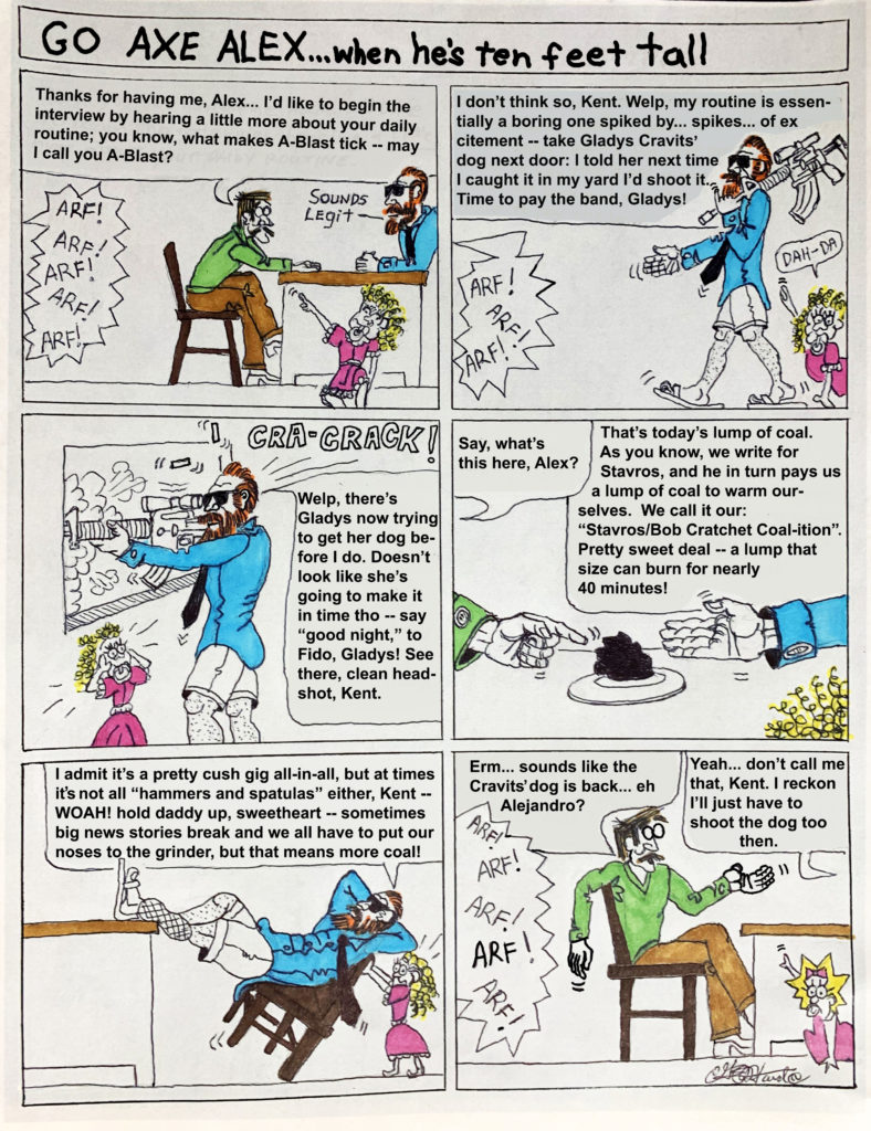 This bonus edition of the monthly cartoon features a continuation of the “Go Axe Alex” series. Alex carries on his interview with his obsequious neighbor Kent while wrangling with the annoying dog of his next-door neighbor Mrs. Cravits. Alex’s small daughter Reggo manages to cameo in every frame in some capacity.