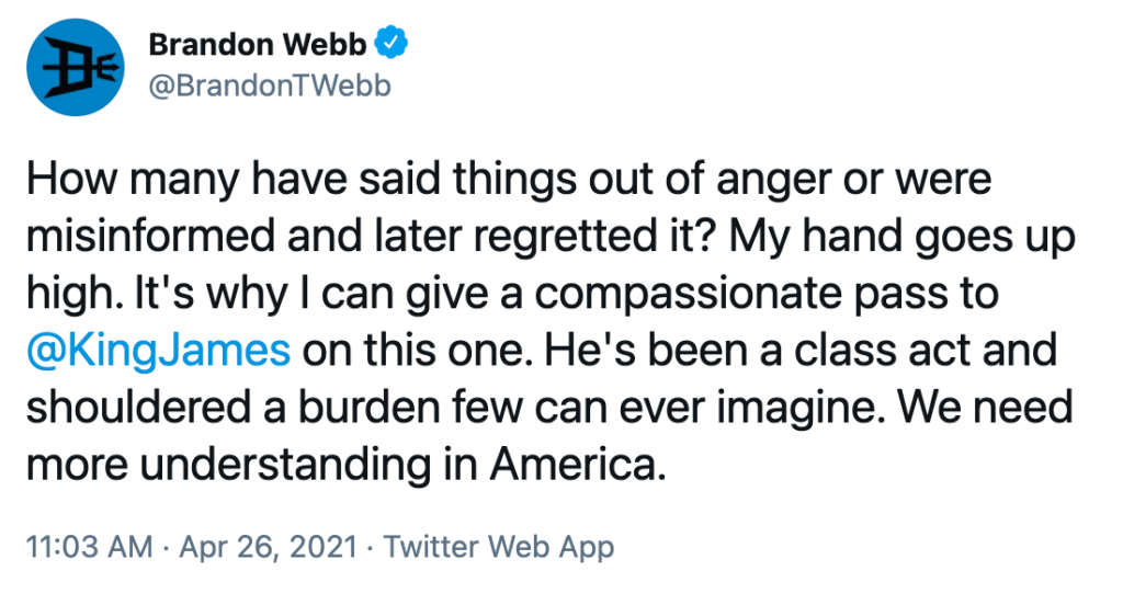 That includes me. You see, I got myself arrested once as a young Navy SEAL for slugging a cop. He had grabbed me from behind and I acted reflexively and without thinking and elbowed him in the face. Does that mean I hate cops? Not at all. If I had a moment to think first I wouldn’t have done it. But like LeBron, I acted in the moment on pure trained reflex and emotion.
