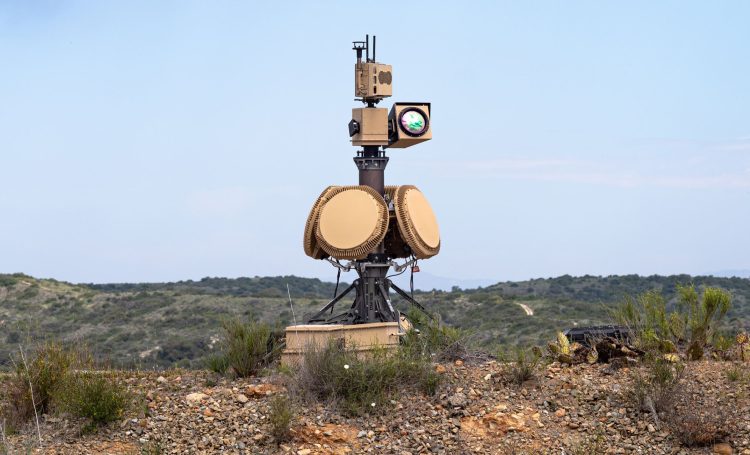 A cutting-edge Anduril Sentry Tower stands vigilant, equipped with advanced radar and sensor arrays to autonomously detect and track drones and other threats for perimeter defense. Image Credit: Anduril Defense Systems