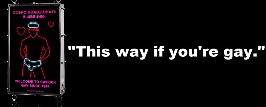Along with the hip-swinging sailor and some hearts, the sign also says in both Russian and English, “Welcome to Sweden. Gay since 1944.” That year alludes to when the Swedish national government legalized homosexuality.