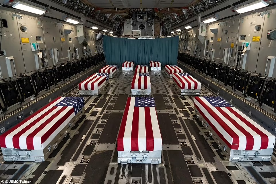 The US Marine Corps posted a photo to Twitter, of the flag flag-draped caskets of their fallen Marines, sailors and soldiers killed in Thursday’s suicide bomb attack in Kabul, after the ir remains arrived at Dover Air Force base in Delaware, August 29, 2021