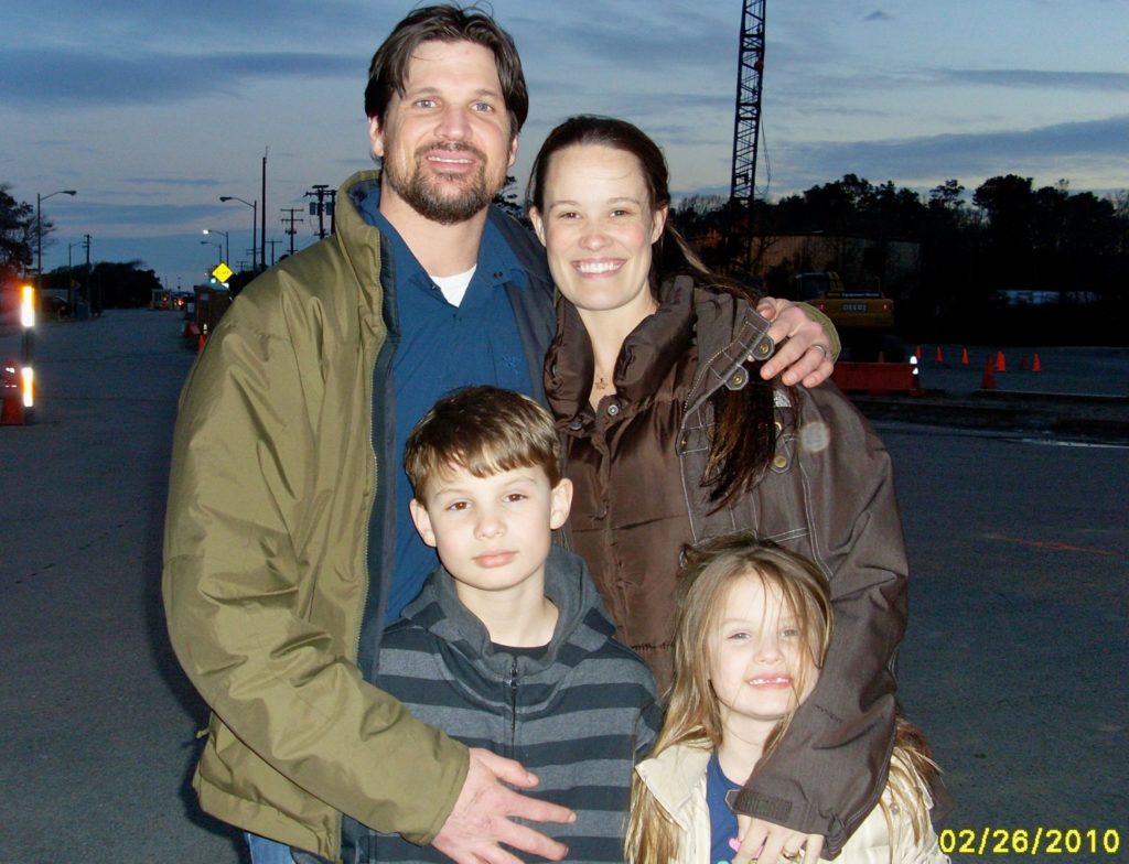 February 26th was Adam’s day to report for his deployment to Afghanistan. Early that evening, the family shared dinner at Chili’s. Immediately after dinner, it was off to the base, where they would say their goodbyes. Leaving your wife and children, knowing there is a fair chance you will never see them again, is an unspeakable mixture of sadness and pain. The kids tried to be brave, but inevitably, the tears started streaming down their little faces. Finally, Adam turned to his 10-year-old son and told him, “This is the last time, buddy, last time.” He picked up his daughter, gave her a big hug, and told her, “Bye, little baby; it’s all fine.” Then, putting Savannah down, he turned to Kelley, “You come home,” she said. “I promise,” Adam replied. They shared a final kiss, and Kelley felt strongly compelled to have the gate guard snap a quick family photo. It is shown below.