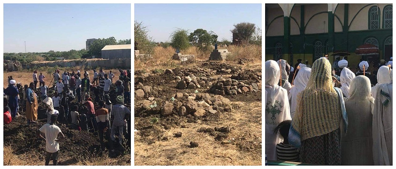 Mass graves (center) and funeral services (left and right) for the victims of the Mai Kadra massacre (Source: Wikimedia)