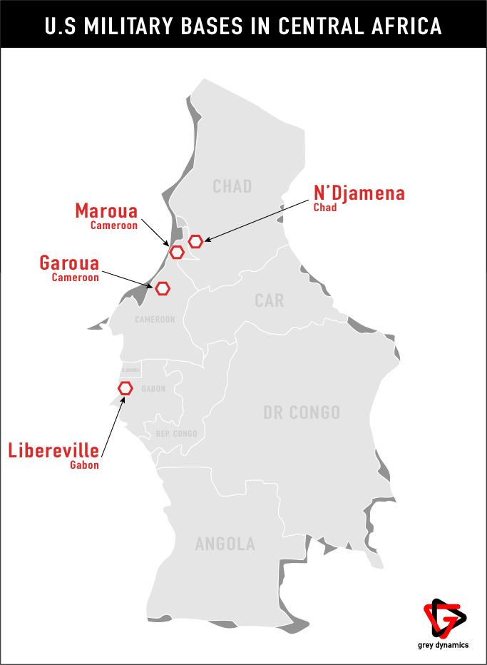 The map below shows the U.S. military bases in Central African countries. Their closeness to the Gulf of Guinea is obvious. This is where most of the oil in the region is extracted.