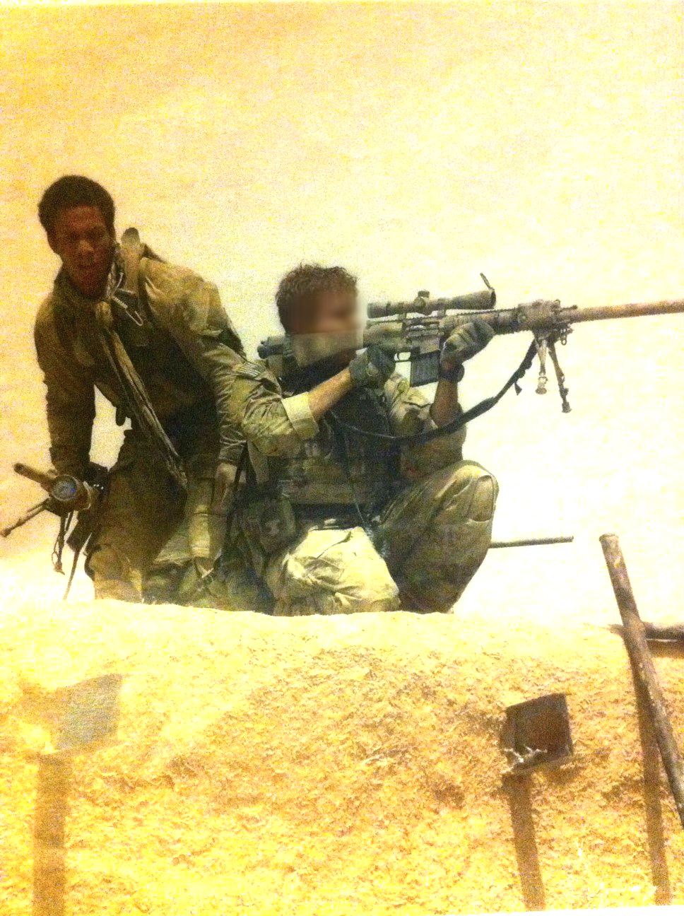 Talking my spotter onto a building I believed the sniper to be in about 500 yards away, another snap passed overhead, impacting behind my shoulder. “I got him!” my spotter shouted out to me. In the process of telling me where the shot originated, “P” saw two men from the corner of his eye approaching danger close to our position. I told him to take care of them while I tried to get a better position in order to take a precise shot through a window. While “P” engaged the men, I tried inching my way up above the depression to get into a steady prone position. “SNAP!” Another round passed just inches away from my head, halting me in my tracks, not allowing me to get into position.