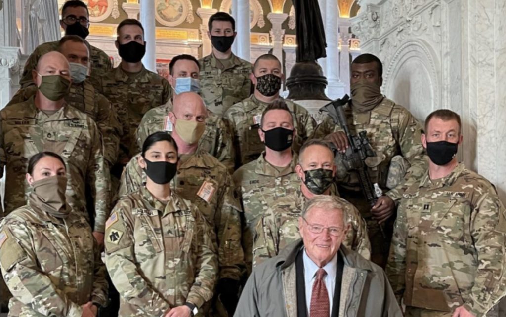 Senator Jim Inhofe (R-OK) poses with Oklahoma NG troops who responded to the January 6 Capitol protests. Office of Sen. Inhofe photo