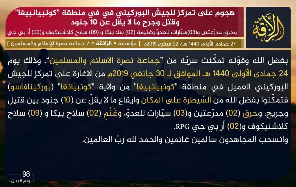Jama’a Nusrat ul-Islam wa al-Muslimin (JNIM) is a jihadi terrorist organization in the Maghreb and West Africa, formed by the merger of Ansar Dine, the Macina Liberation Front, Al-Mourabitoun, and the Saharan branch of al-Qaeda in the Islamic Maghreb (AQIM). It is the official branch of al-Qaeda in Mali, after its leaders swore allegiance to Ayman al-Zawahiri (AQ).